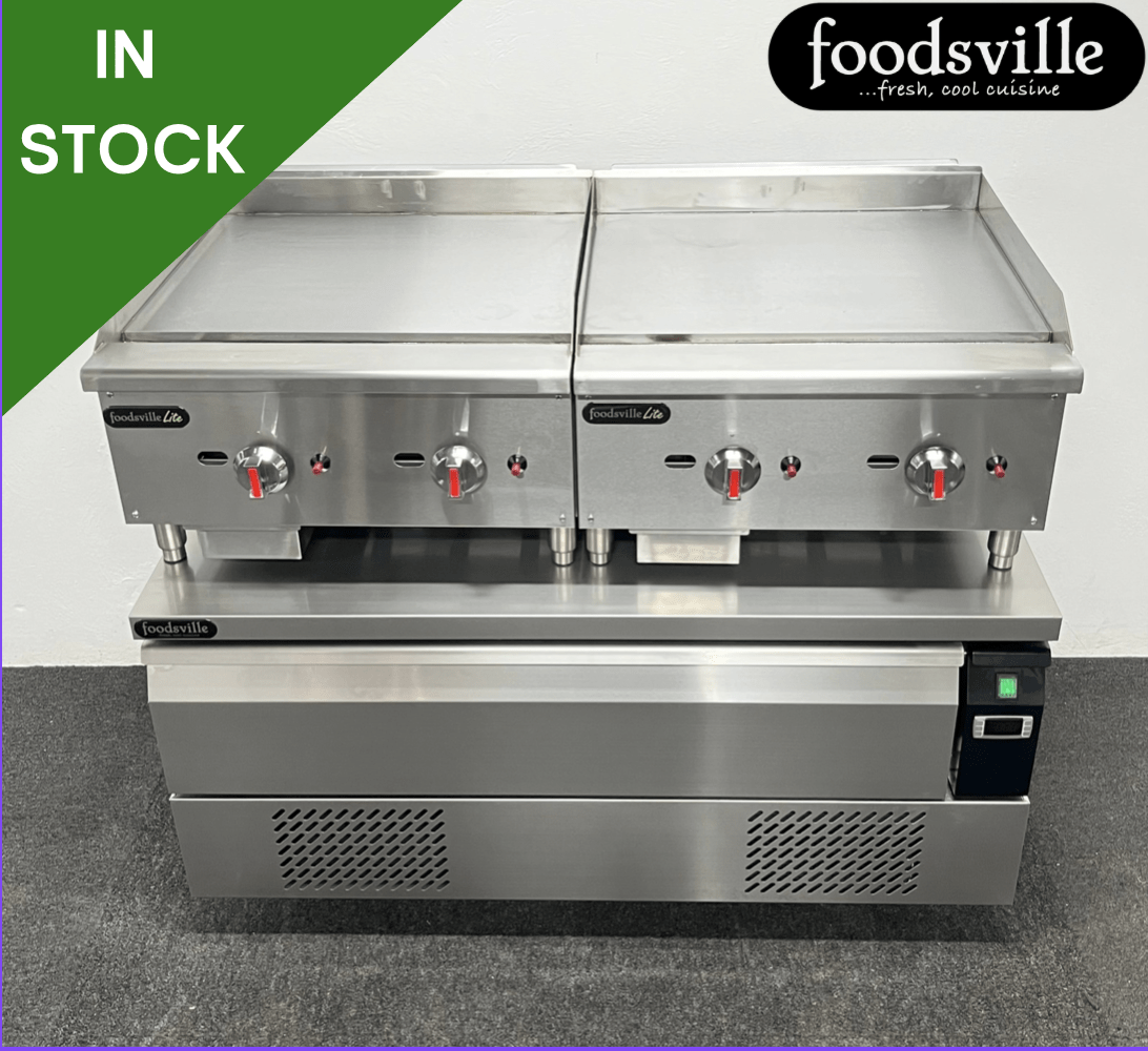 FOODSVILLE COMBINATION: NEW Gas Griddle & Gas Chargrill On CHILLED Double Drawer Chef Base