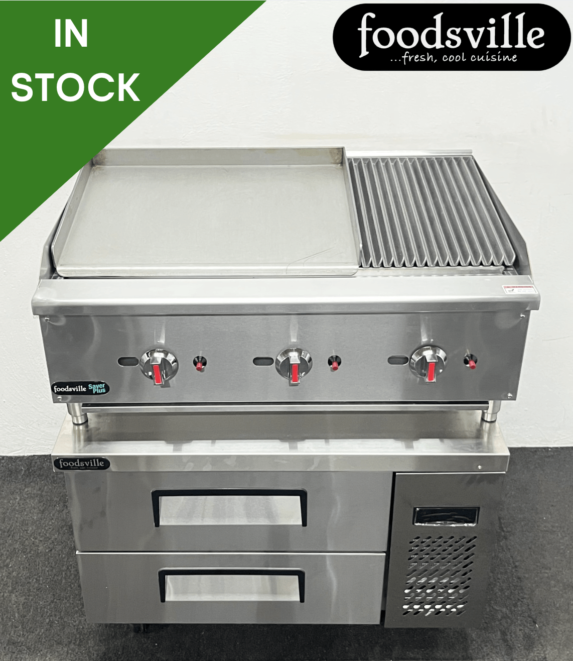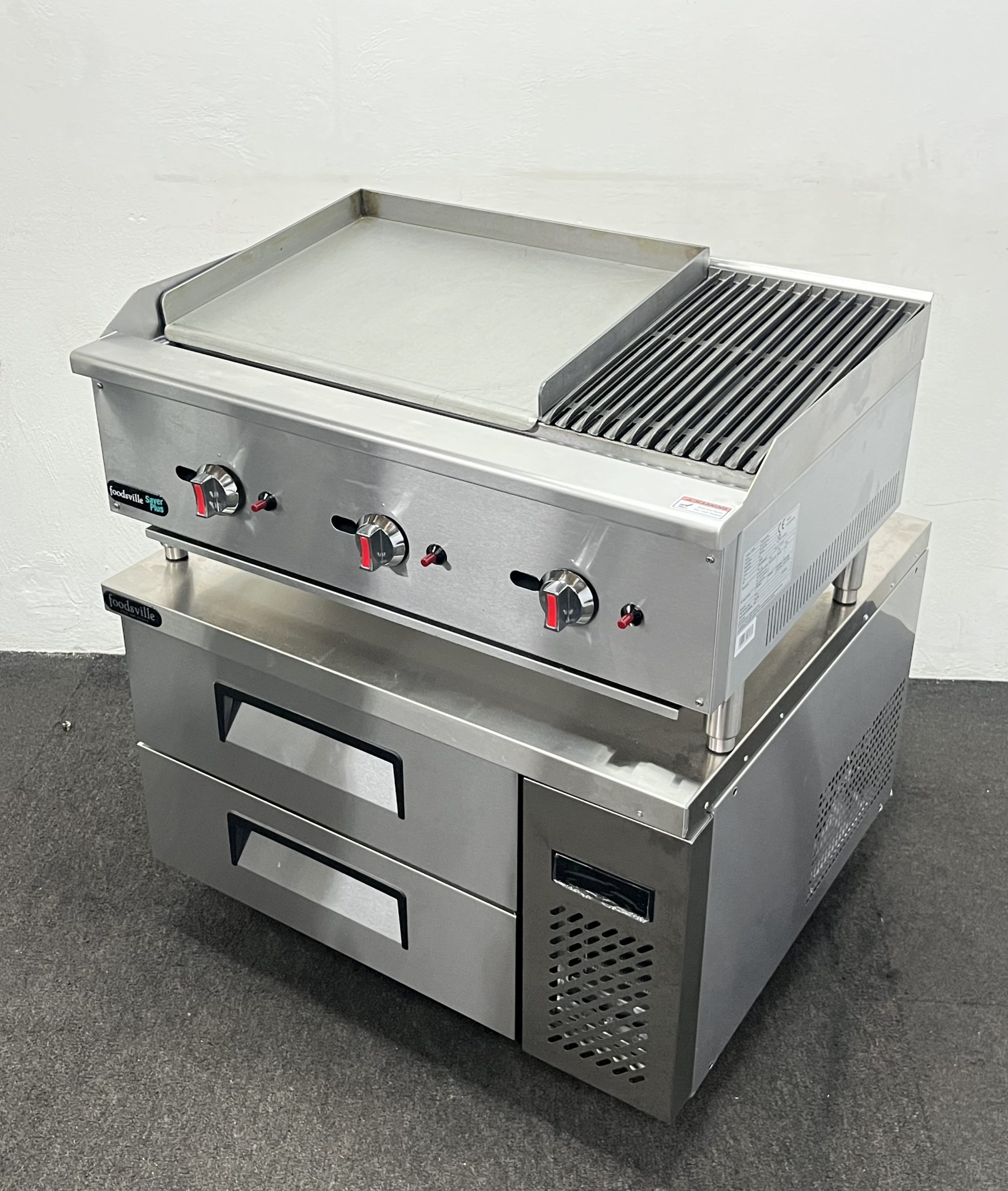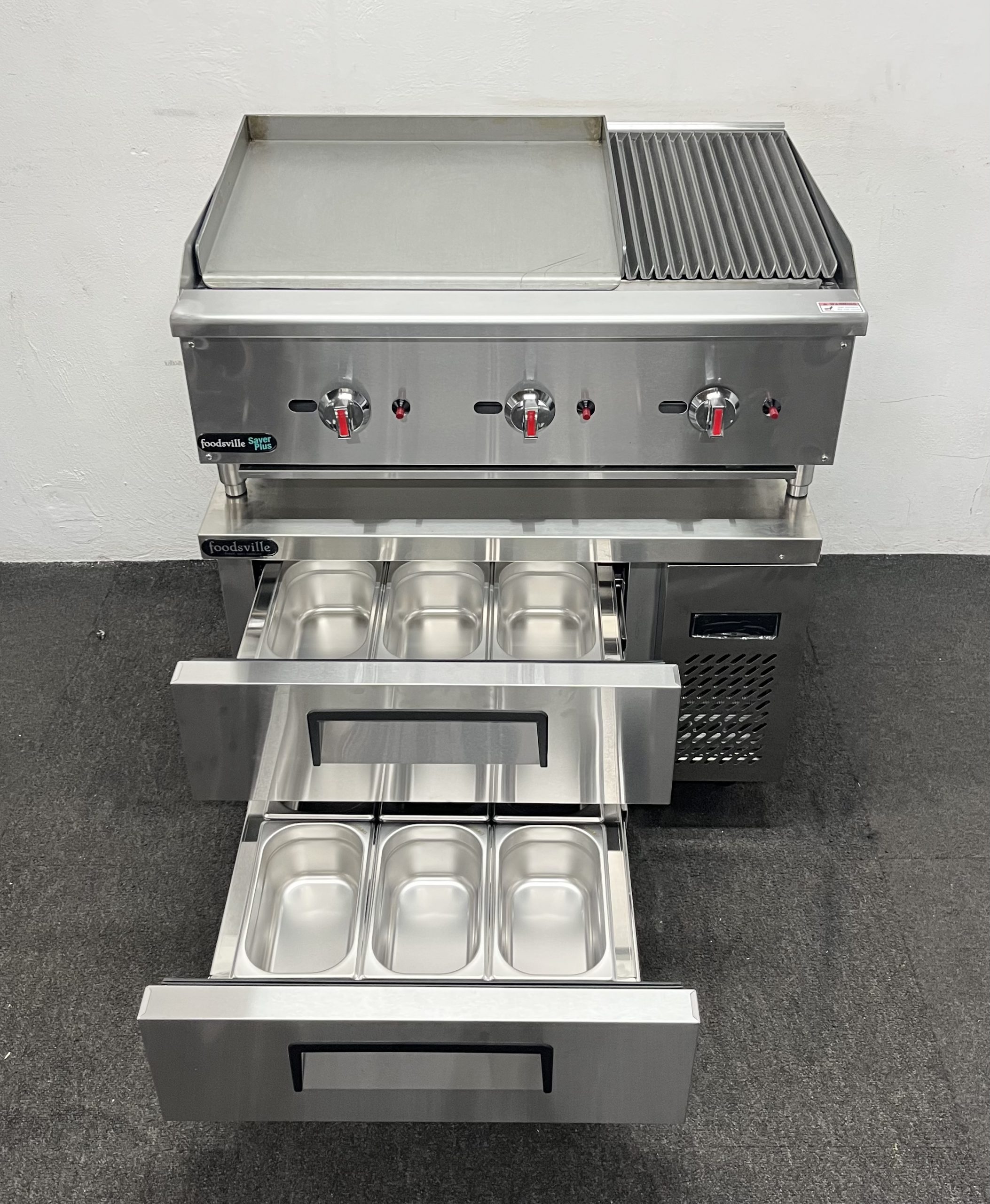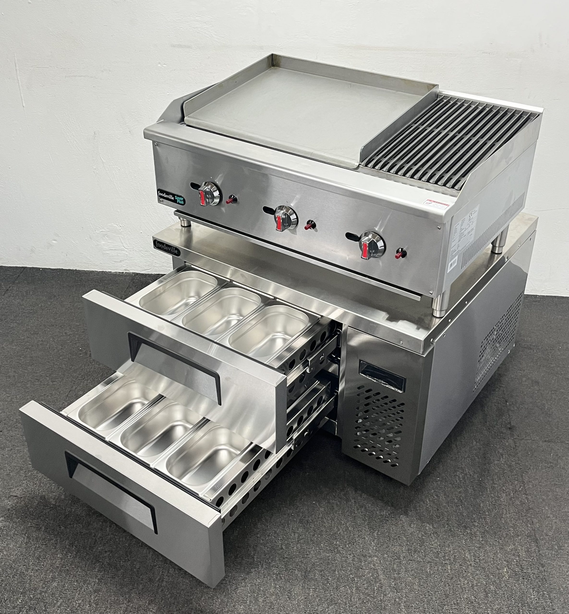 FOODSVILLE COMBINATION: NEW Gas 2/3 Griddle 1/3 Chargrill On Double Drawer CHILLED Chef Base