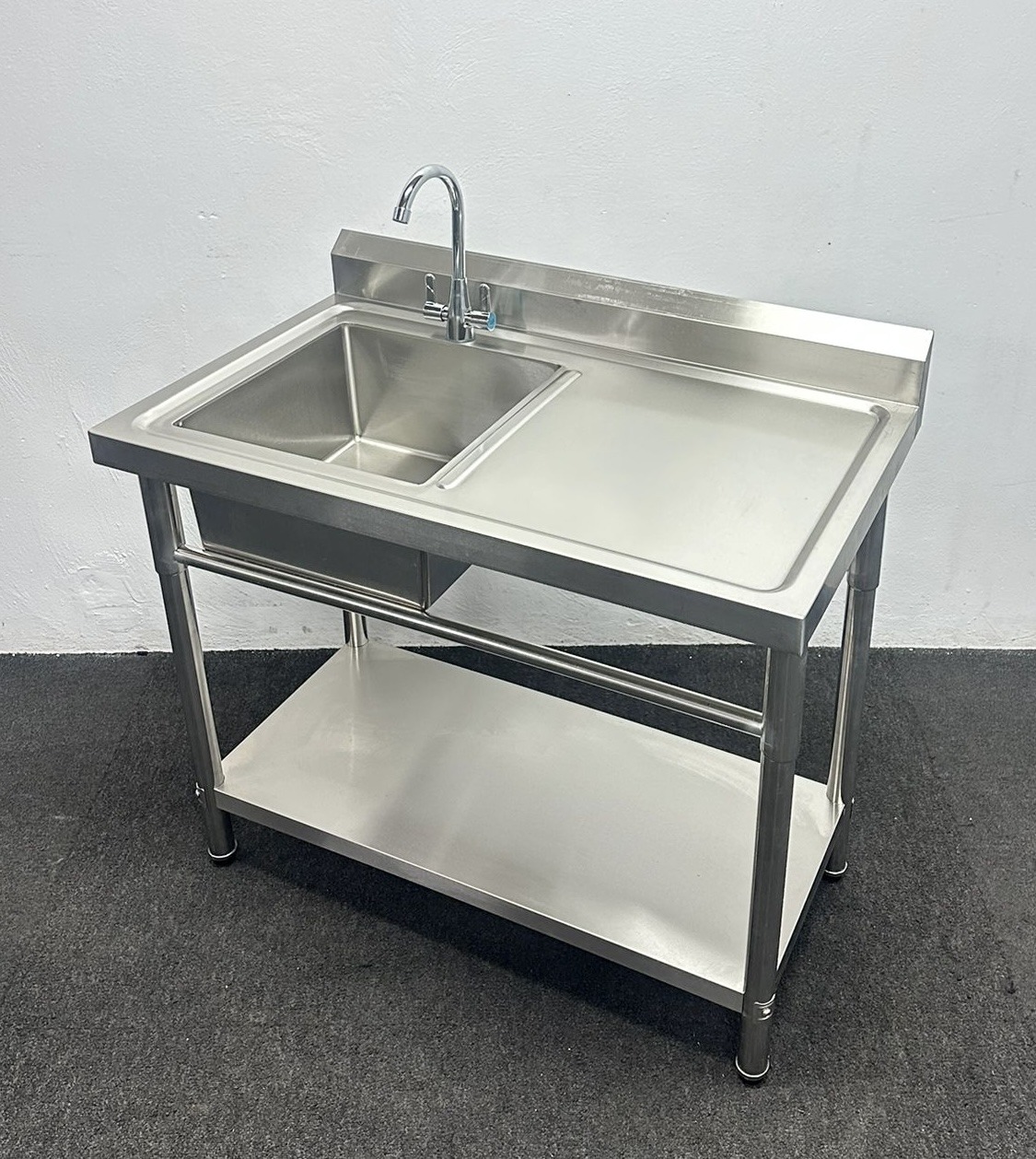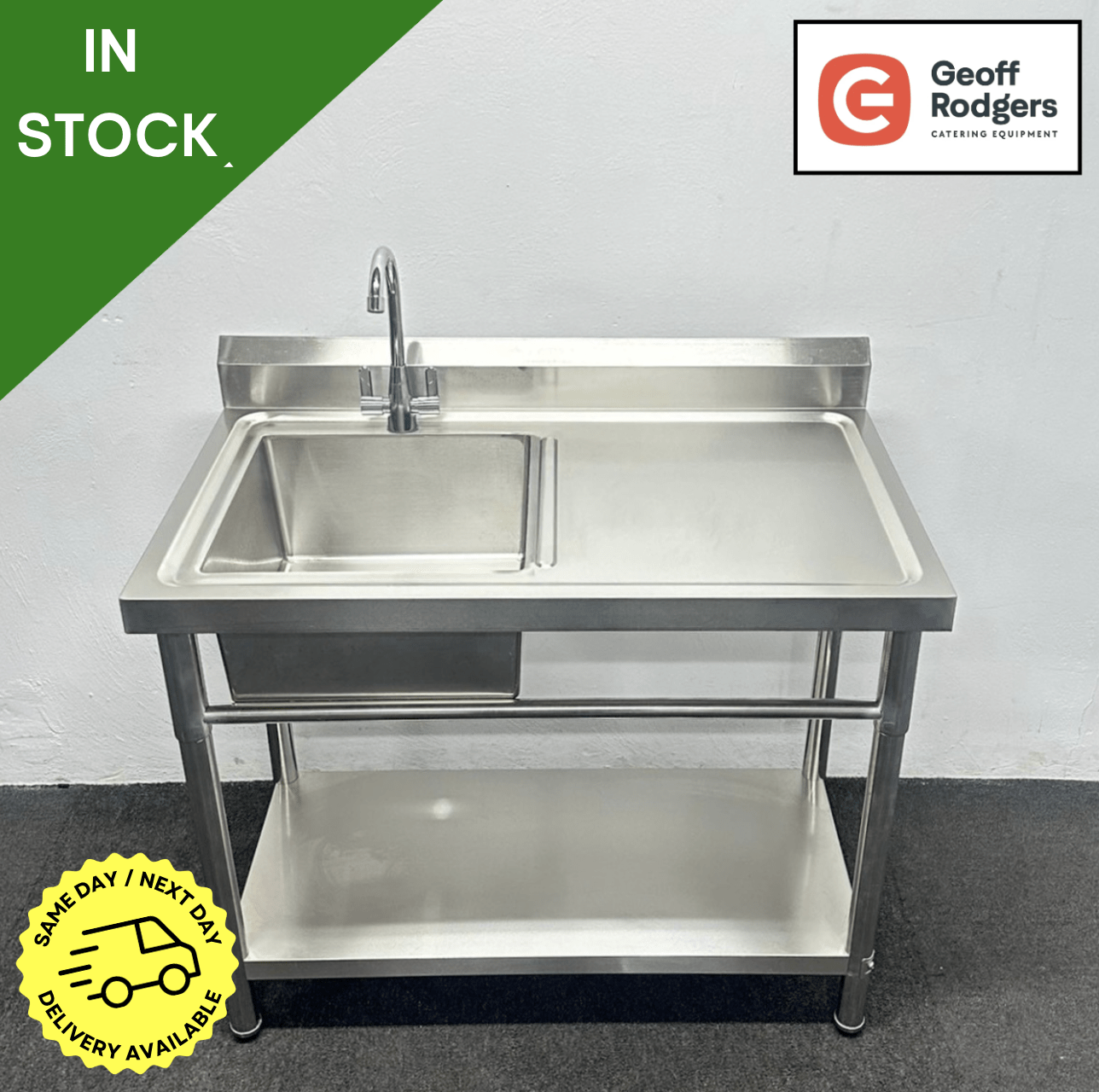 Never Used 1000mm Stainless Steel Single Bowl Sink, With Undershelf – Right Hand Drainer. Includes Taps!
