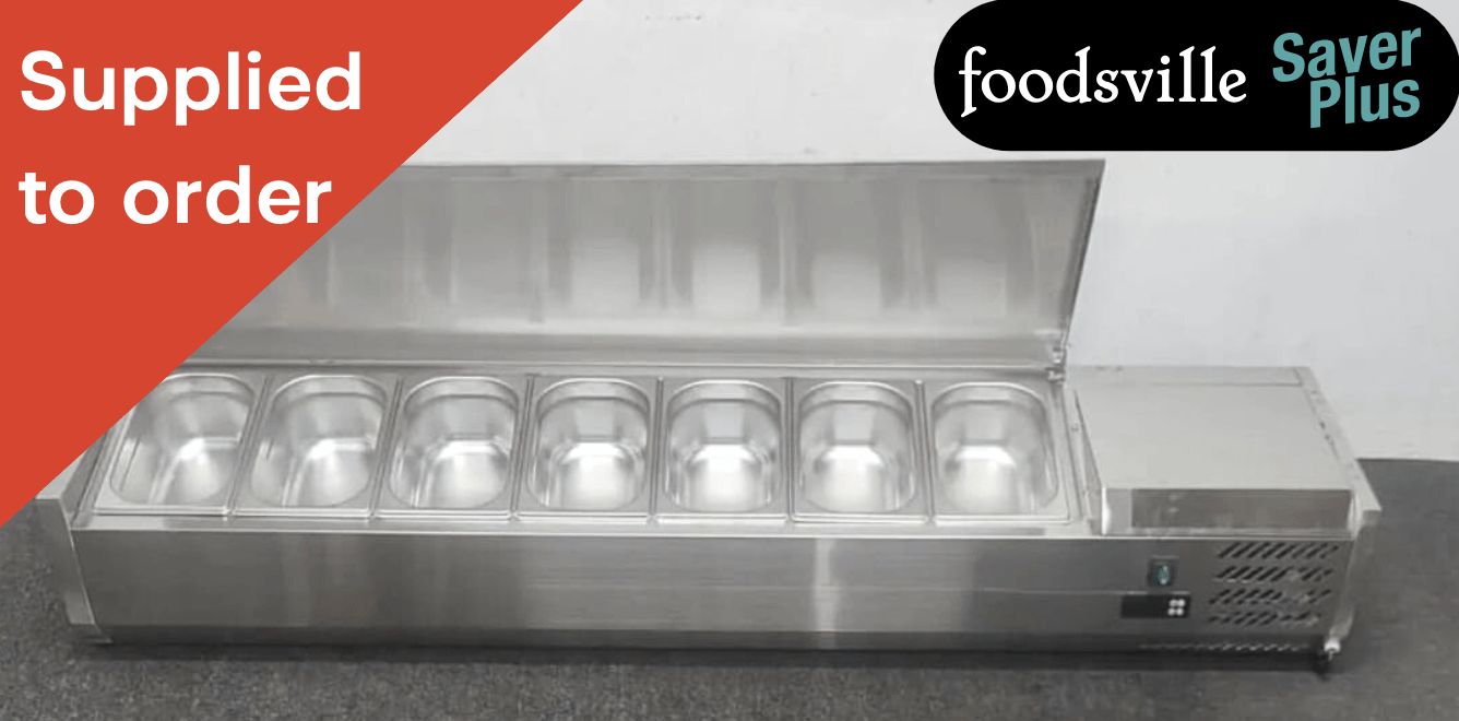 New Foodsville Saver Plus 1500mm Refrigerated Toppings Unit With Stainless Steel Cover & 7 x 1/4 Size Stainless Steel G/N Containers
