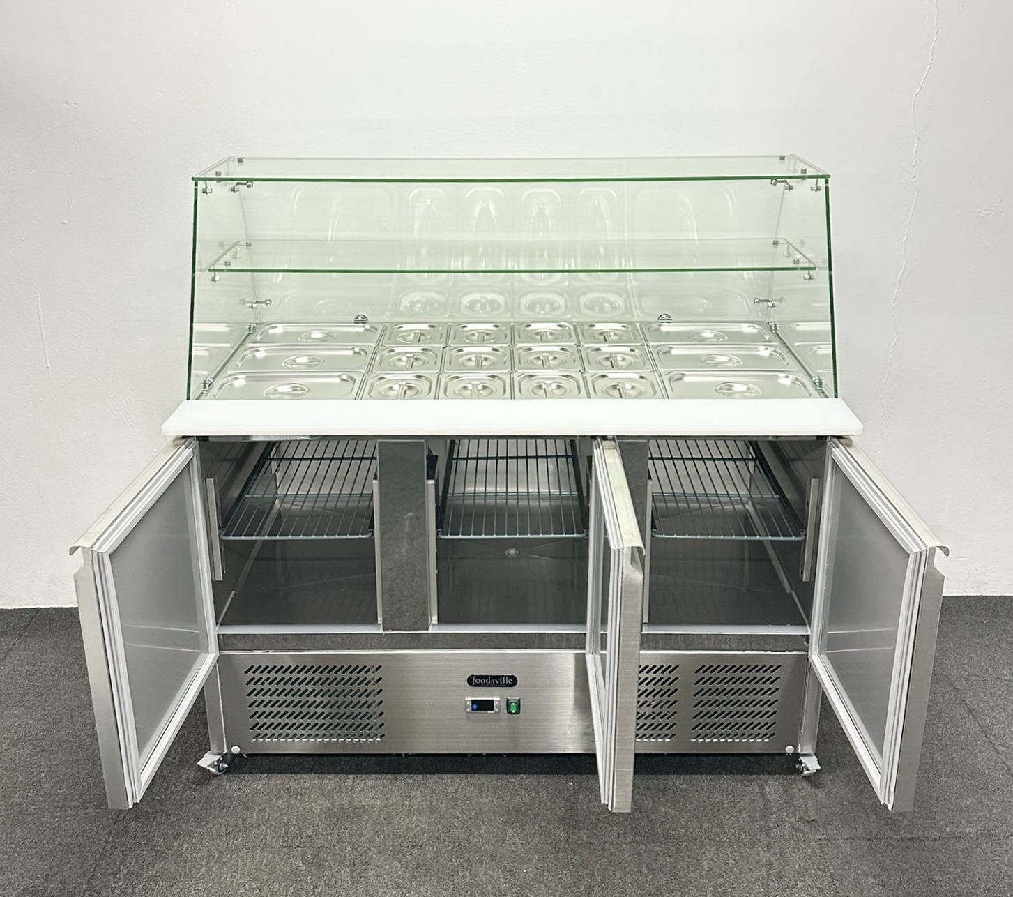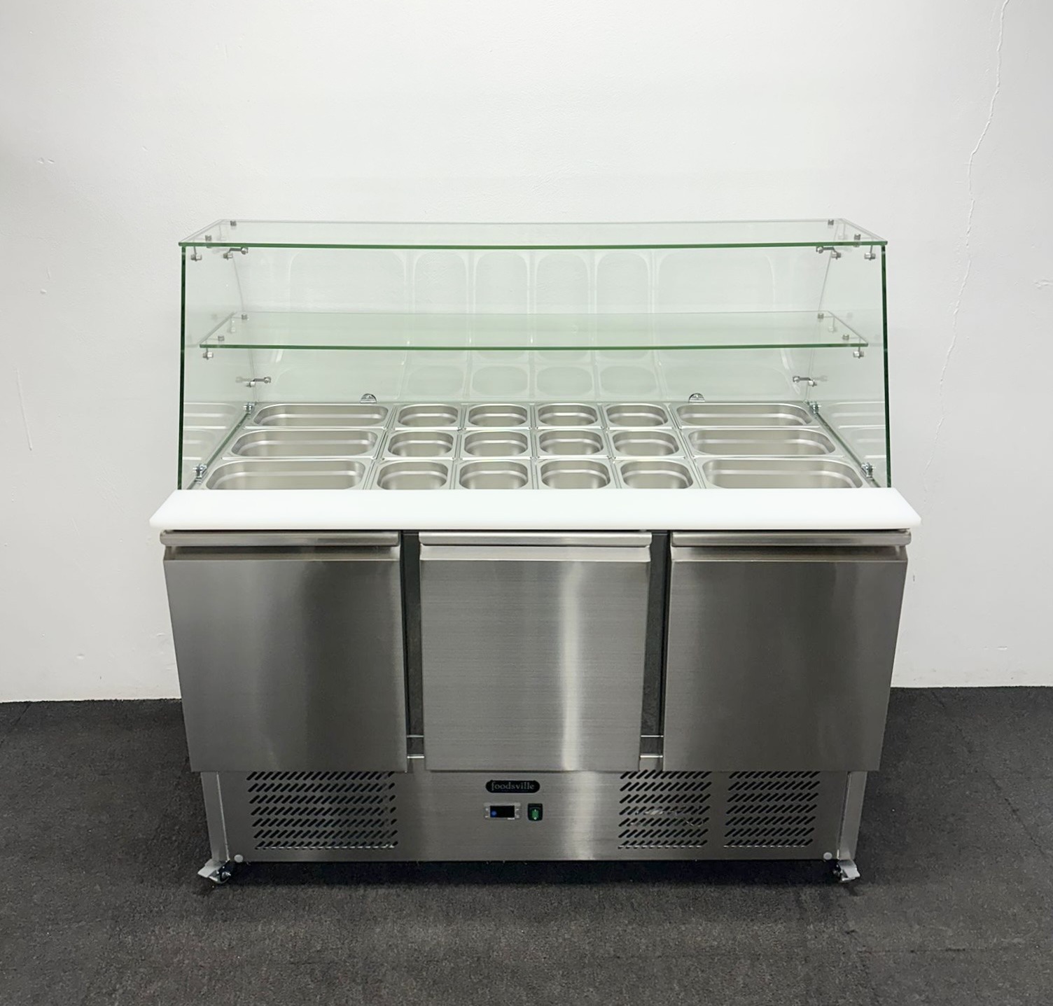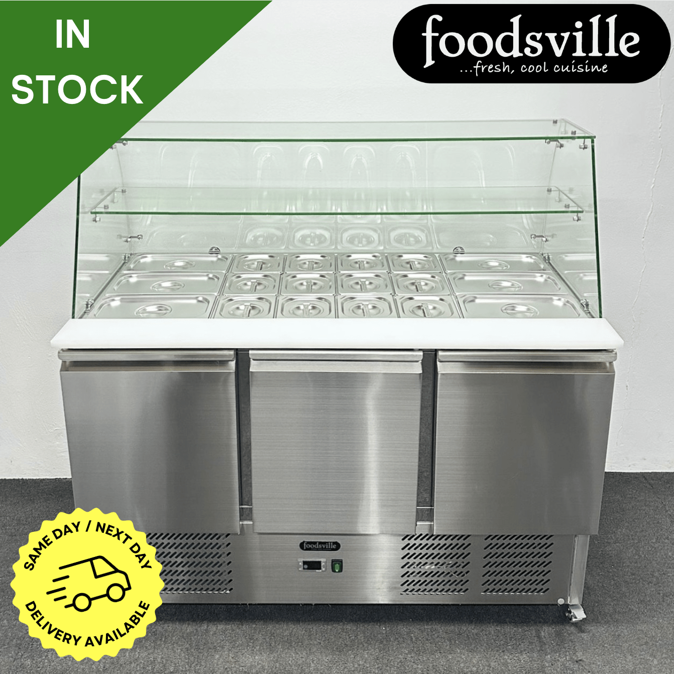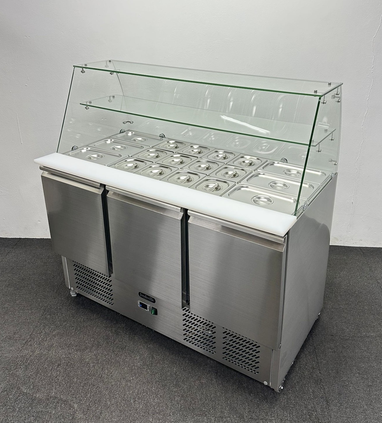 NEW Foodsville 1365mm Refrigerated 3 Door Curved Glass Preparation Counter, On Wheels – Complete with Gastronorm Containers!