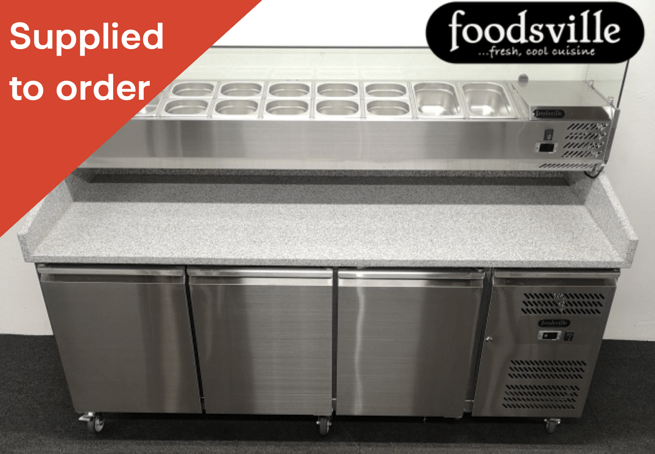 The NEW Foodsville 2025mm 3 Door Refrigerated Pizza Prep Granite Counter on wheels is a comprehensive solution for pizza preparation, combining ample refrigerated storage and a dedicated toppings area. It requires 2 x 13 amp plug supplies for full functionality, ensuring easy setup. This counter comes with Gastronorm containers and lids, facilitating organized ingredient storage. Featuring fully automatic refrigeration and three large refrigerated doors, it maintains optimal temperature control. Mounted on castors, this heavy-duty unit is designed for easy mobility within the kitchen. A separate refrigerated toppings unit enhances efficiency, making it ideal for busy commercial settings.