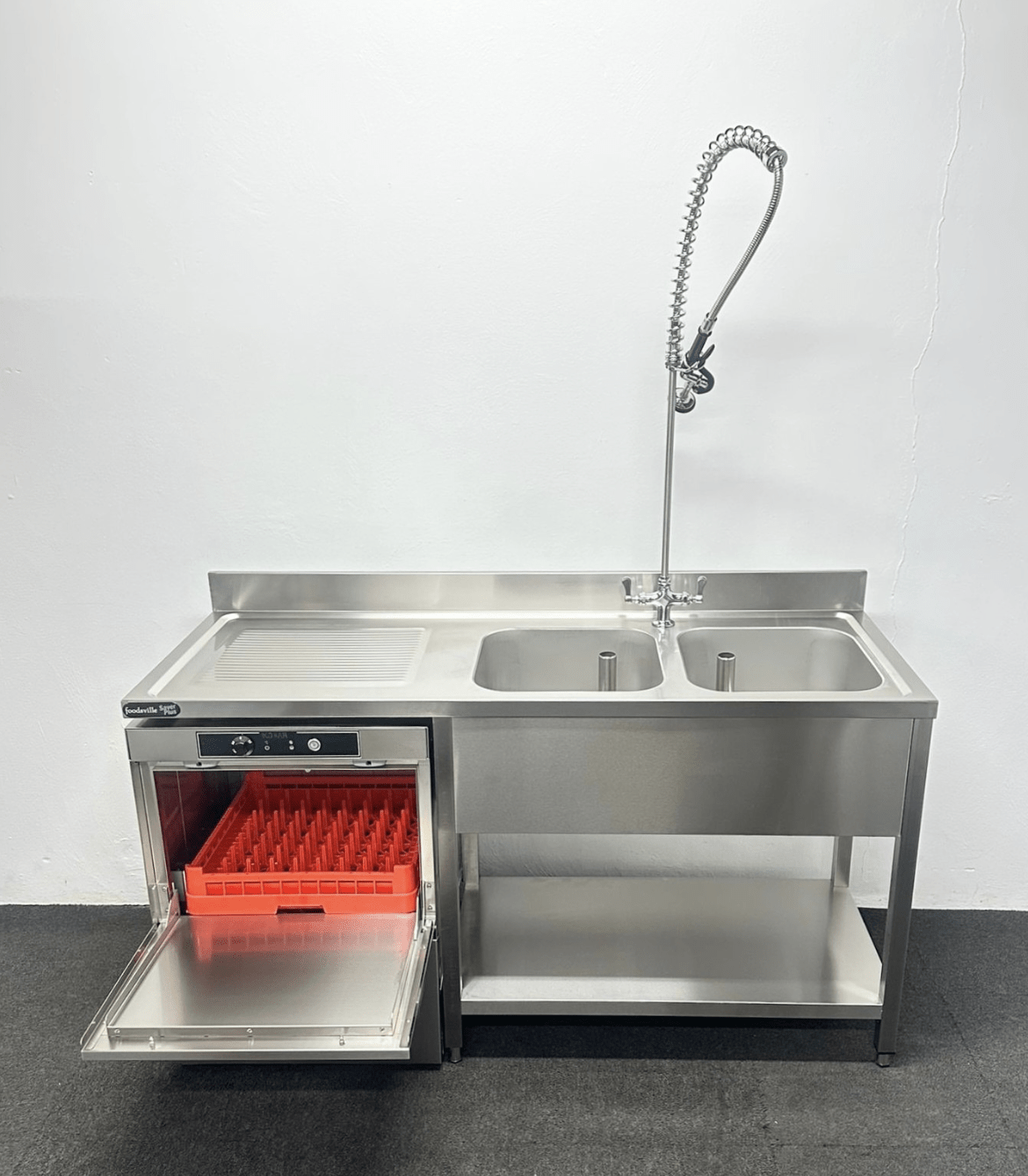 NEW Foodsville 500mm Basket Stainless Steel Undercounter Dishwasher With Drain Pump & Double Dishwasher Sink With Shower Spray – Single Phase Electric