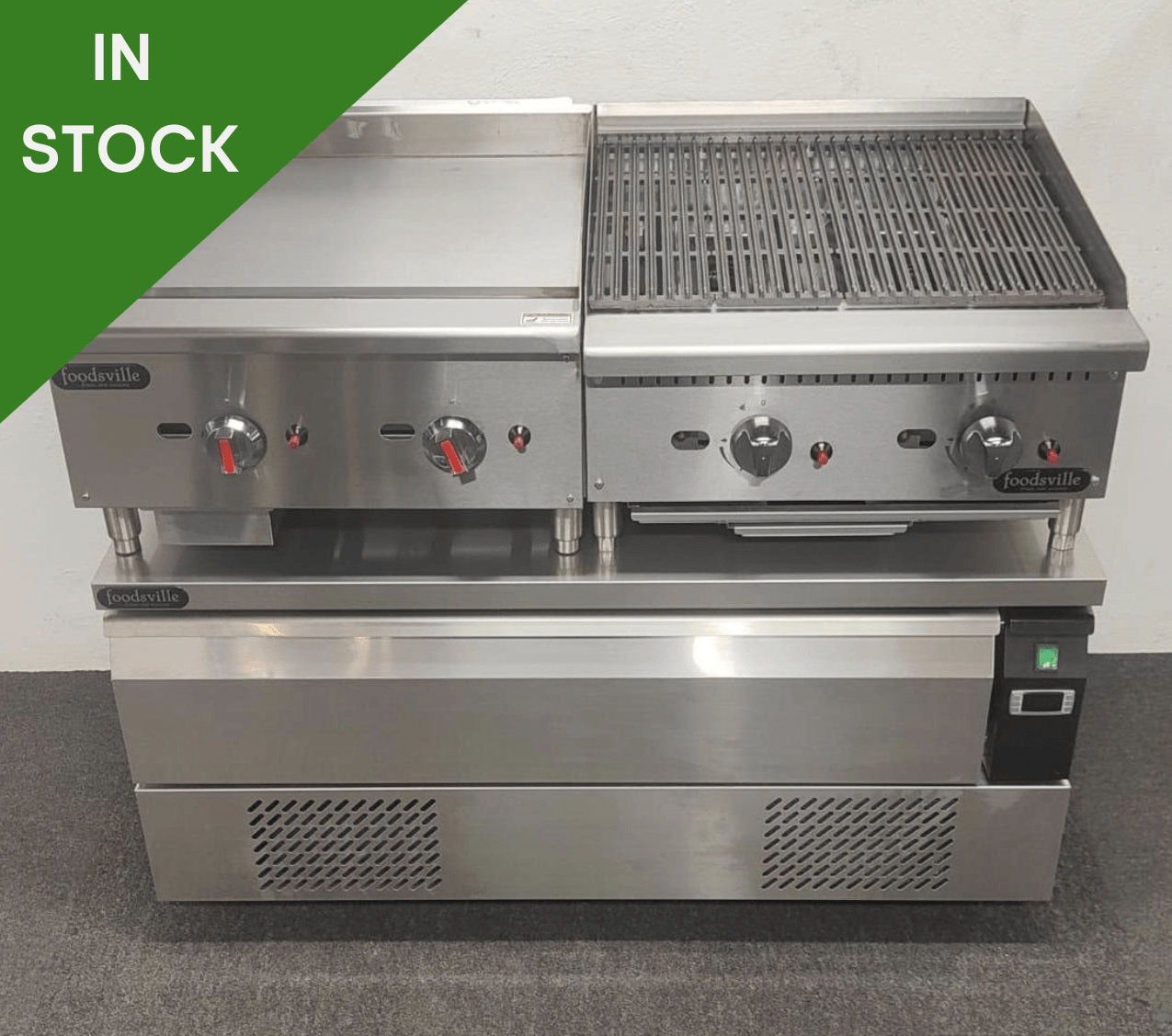 FOODSVILLE COMBINATION: NEW Gas Griddle & Gas Chargrill On Single Drawer CHILLER/FREEZER Chef Base