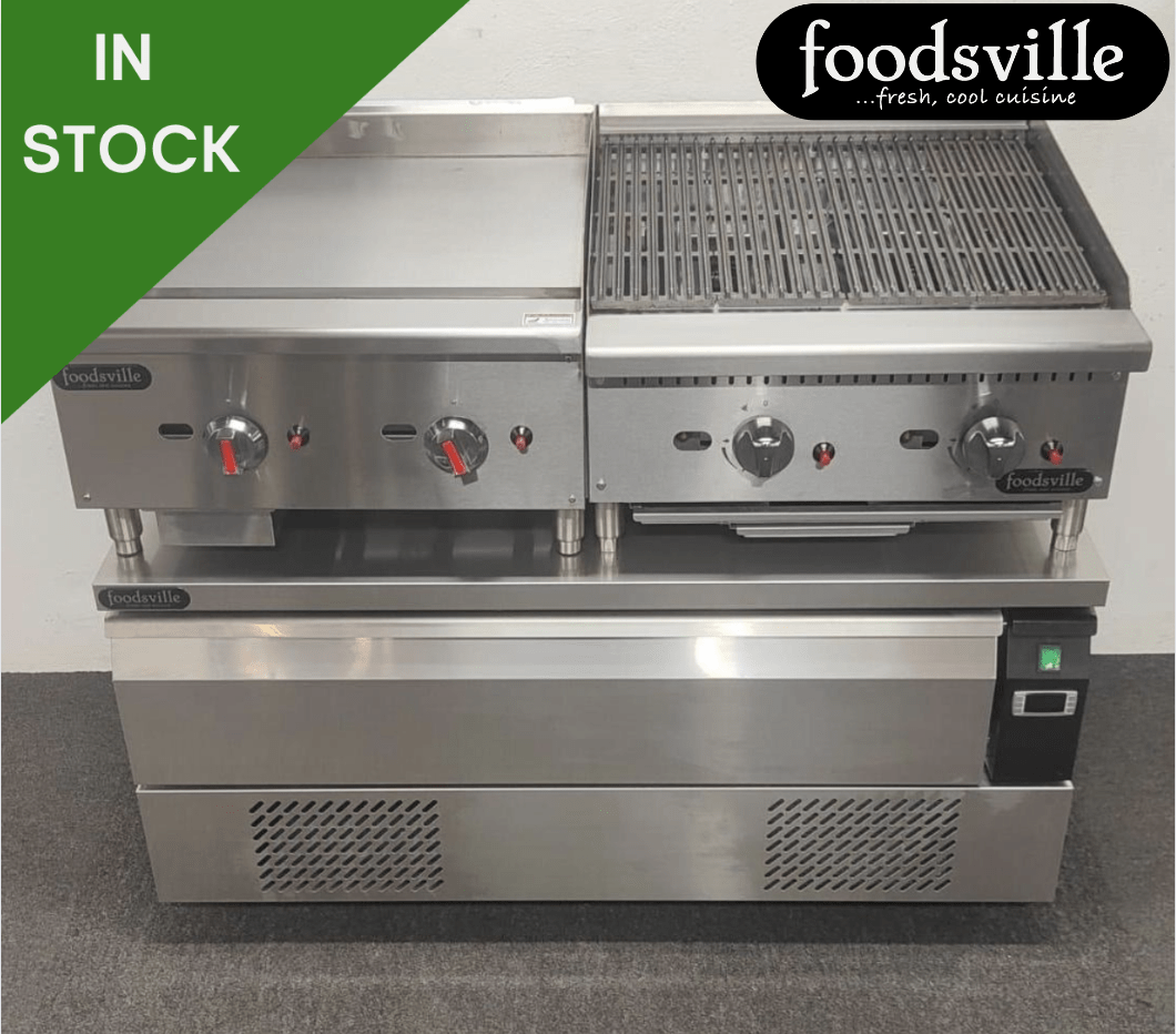 FOODSVILLE COMBINATION: NEW Gas Griddle & Gas Chargrill On CHILLED Double Drawer Chef Base