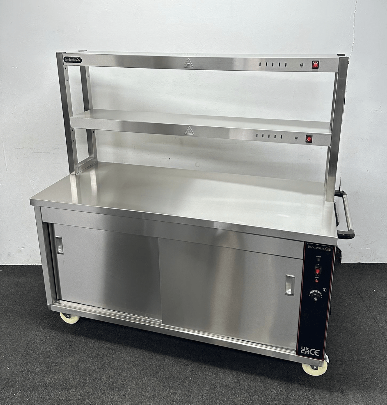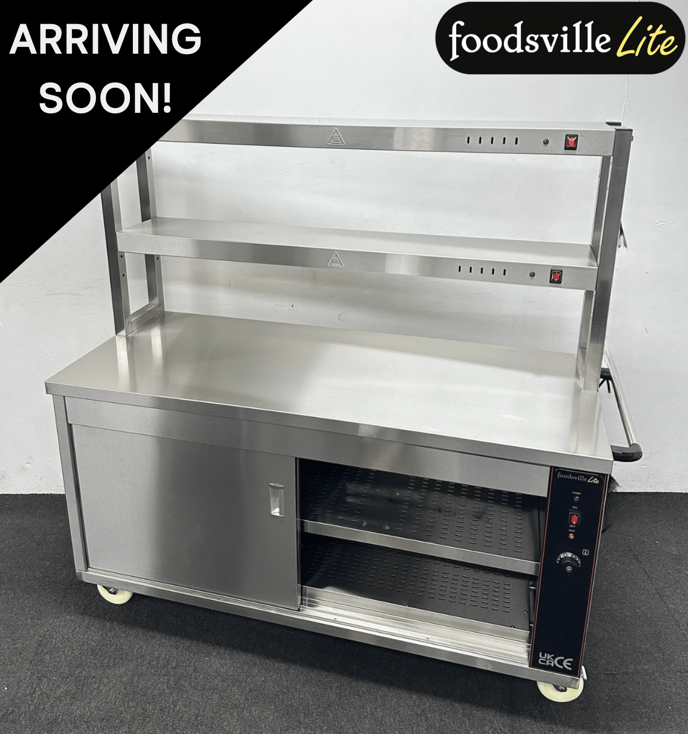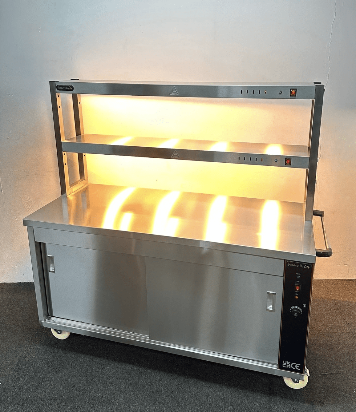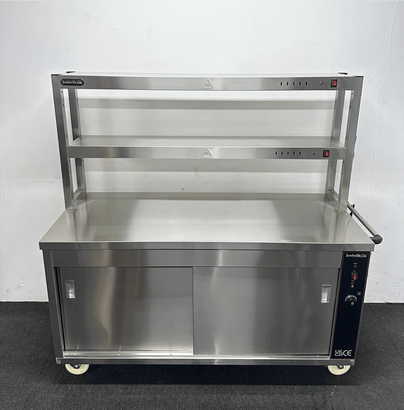 NEW Foodsville Lite 1500mm Stainless Steel Double Shelved Hot Cupboard With Double Heated Overgantry, On Wheels