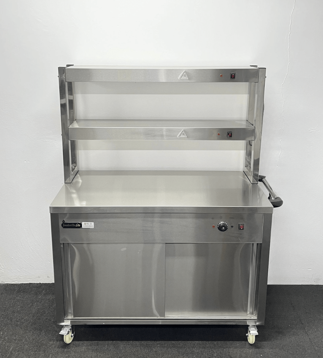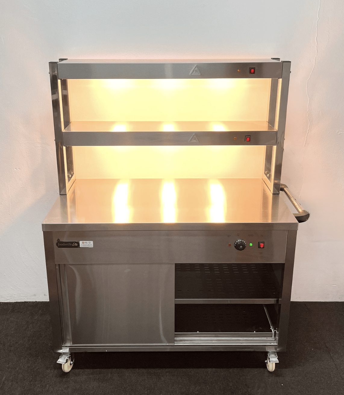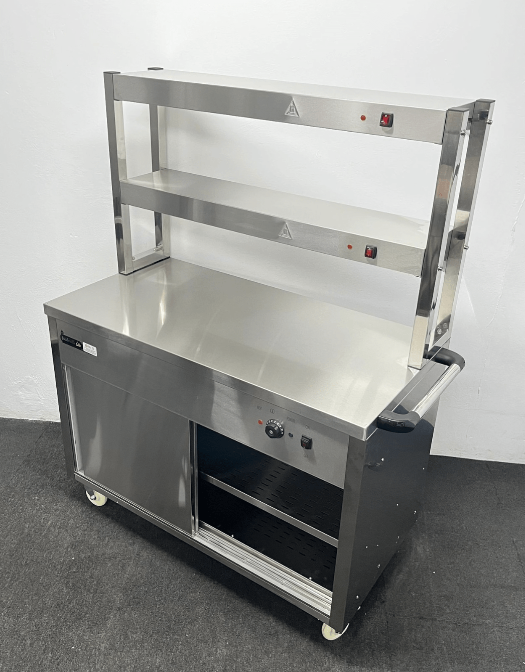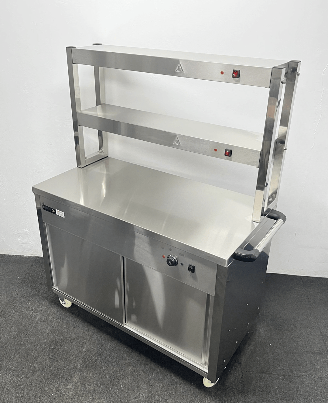 NEW Foodsville Lite 1200mm Stainless Steel Double Shelved Hot Cupboard With Double Heated Overgantry, On Wheels