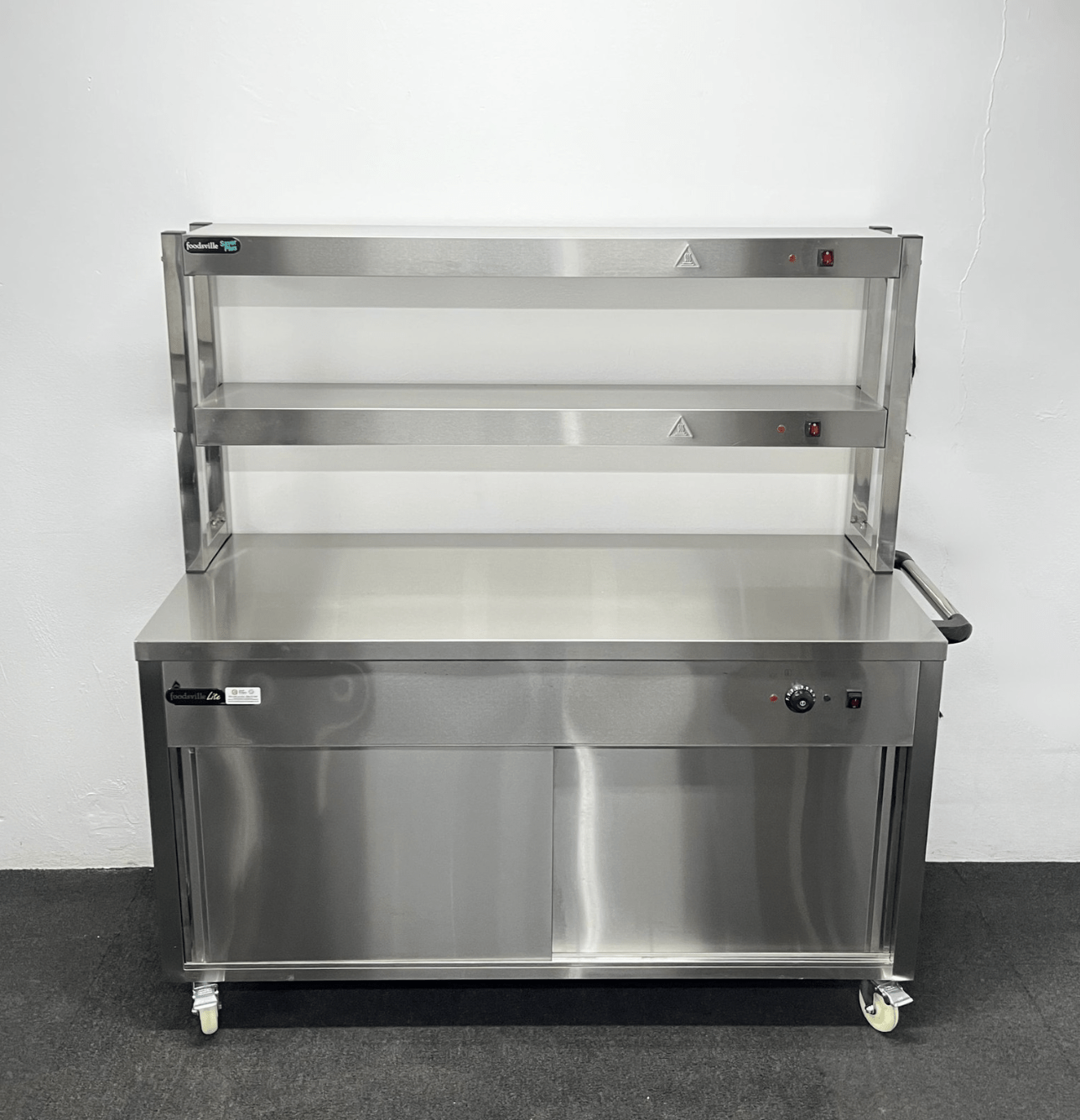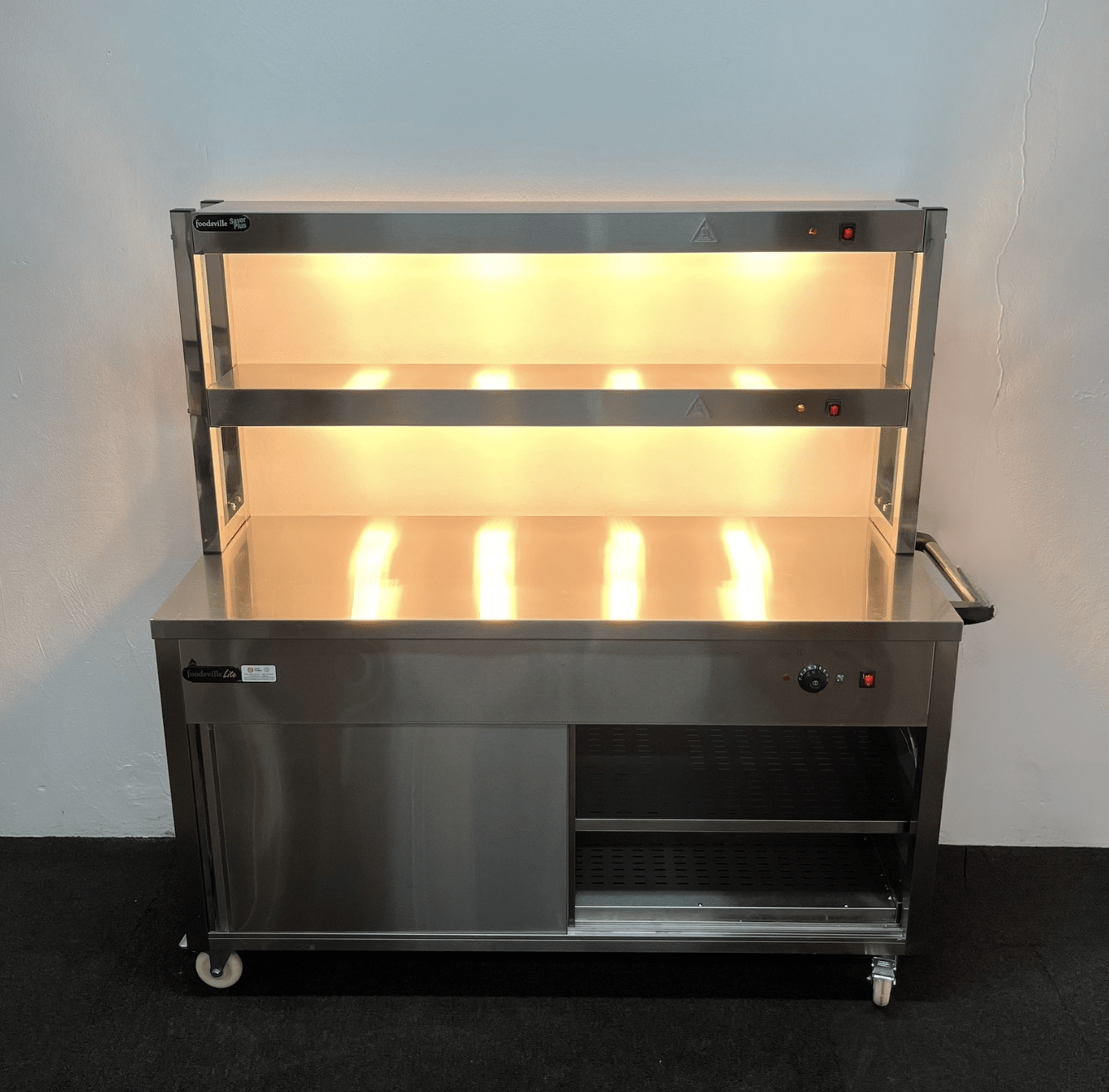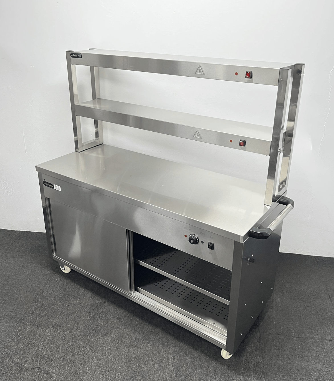NEW Foodsville Lite 1500mm Stainless Steel Double Shelved Hot Cupboard With Double Heated Overgantry, On Wheels