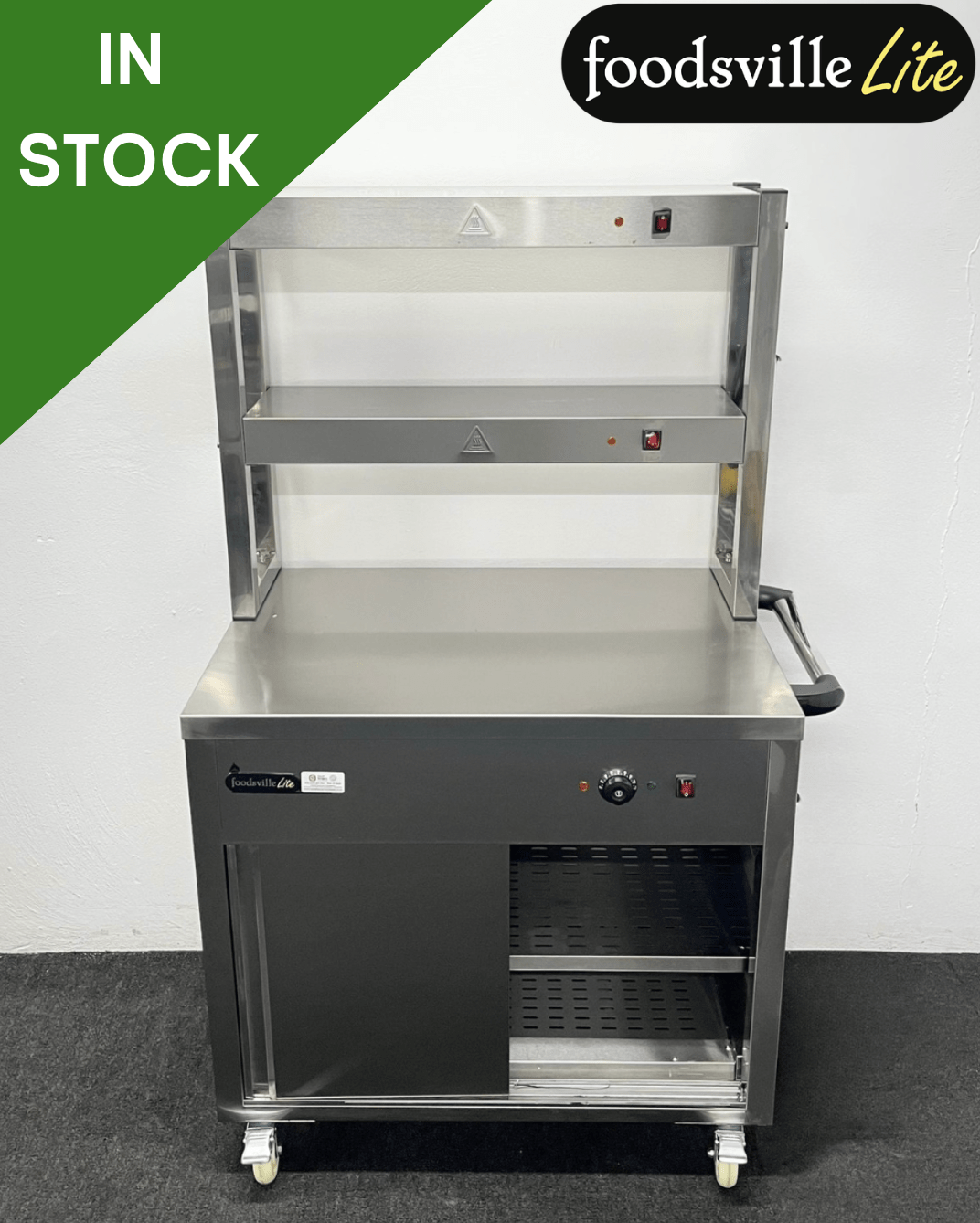 NEW Foodsville Lite 900mm Stainless Steel Double Shelved Hot Cupboard With Double Heated Overgantry, On Wheels