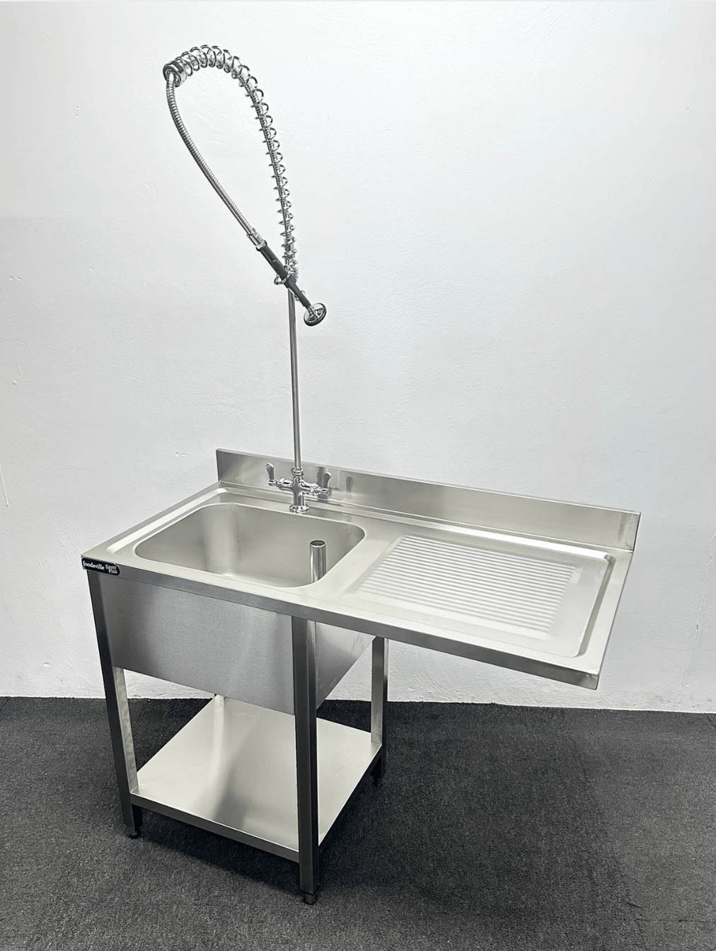 NEW Foodsville Saver Plus 1200mm Stainless Steel Single Bowl Dishwasher Sink With Undershelf & Shower Spray Tap – Right Hand Drainer