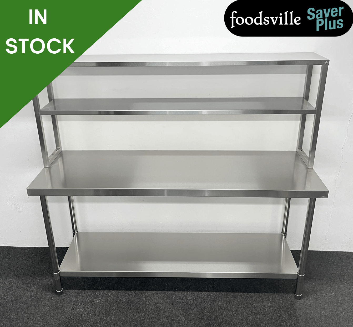 NEW Foodsville Saver Plus 1500mm Stainless Steel Centre Table With Undershelf & Double Overgantry