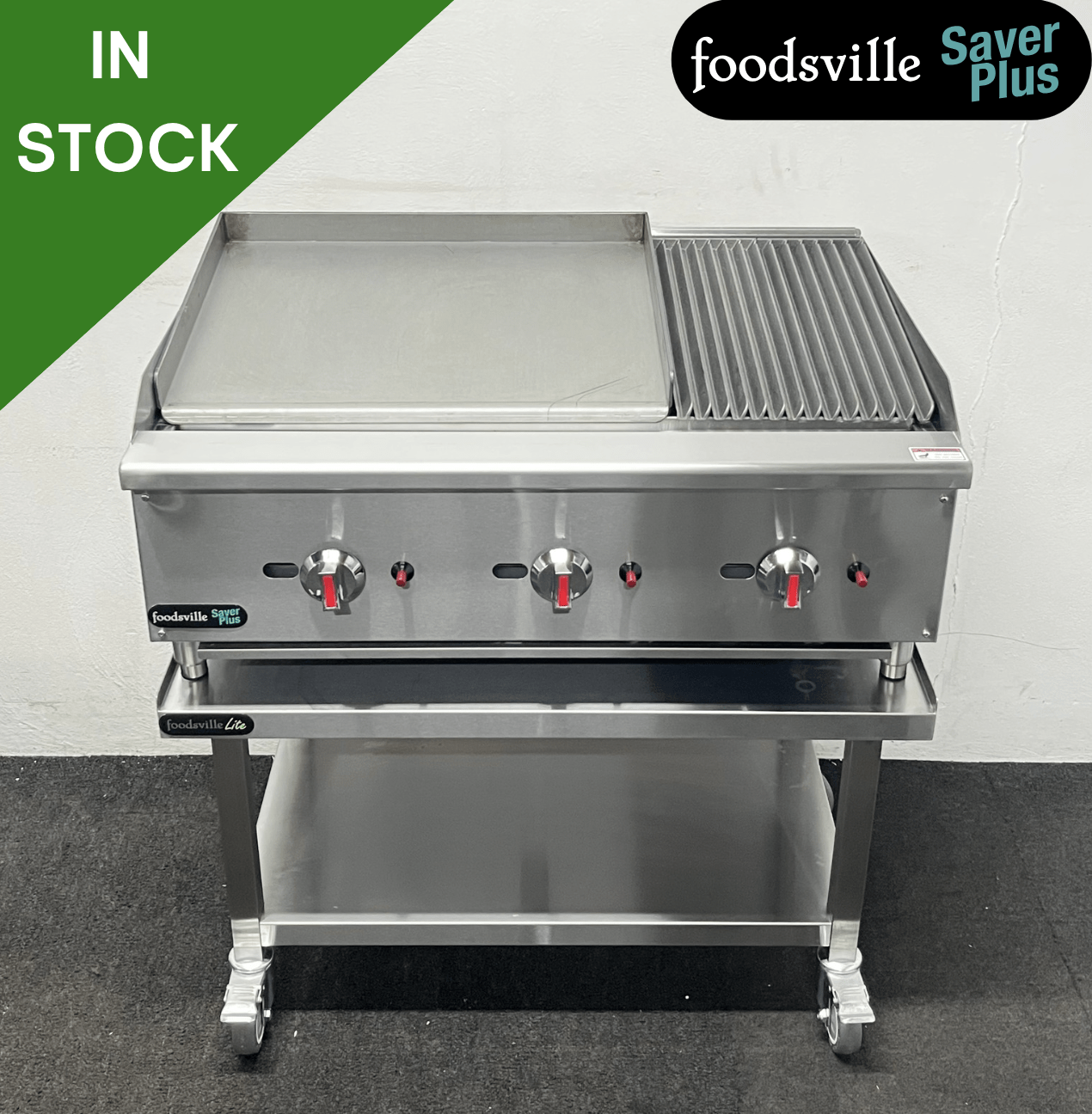 NEW Foodsville Saver Plus 900mm Countertop 2/3 Griddle 1/3 Chargrill, On Mobile Stand – Available on Natural Gas or LPG