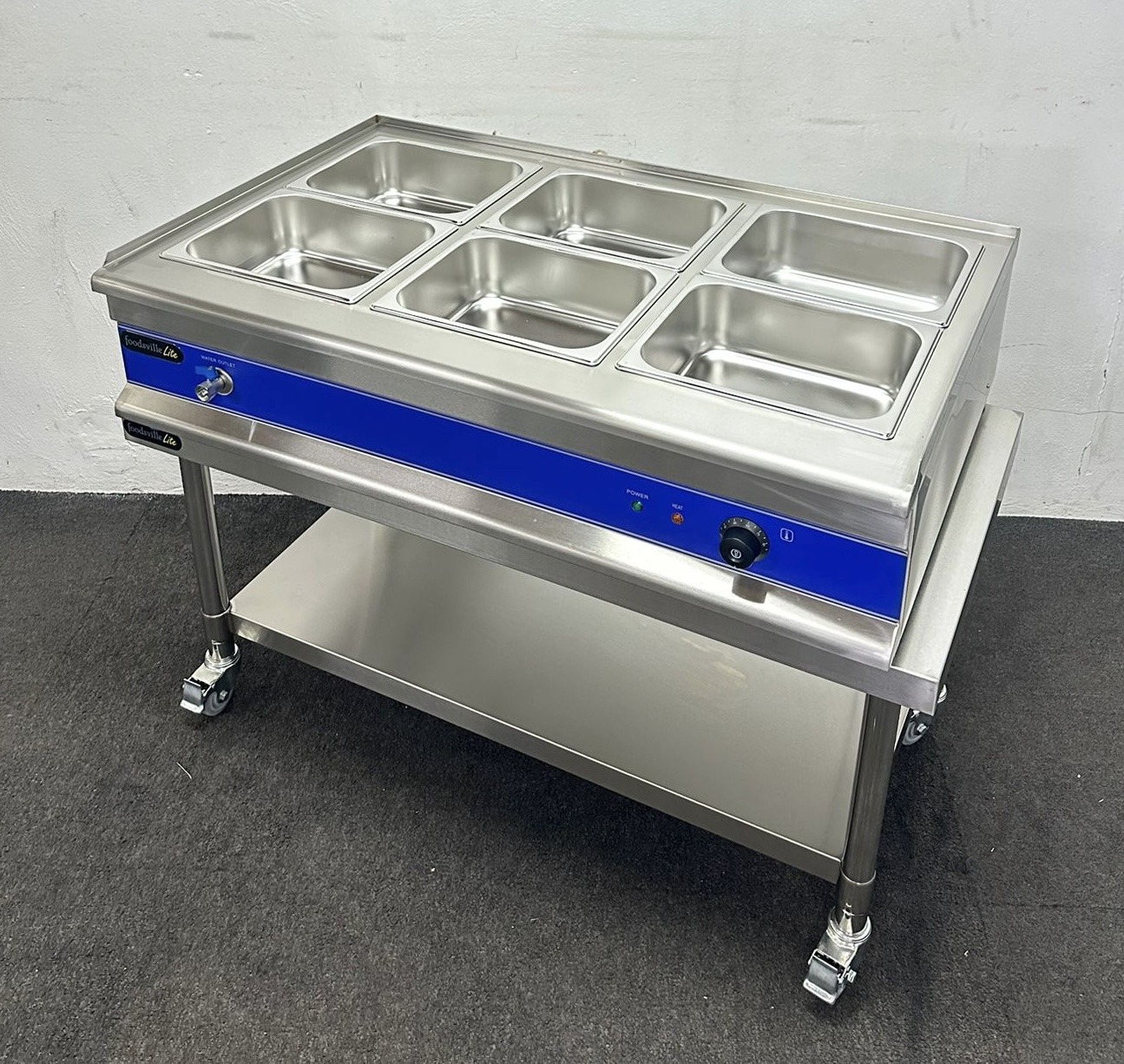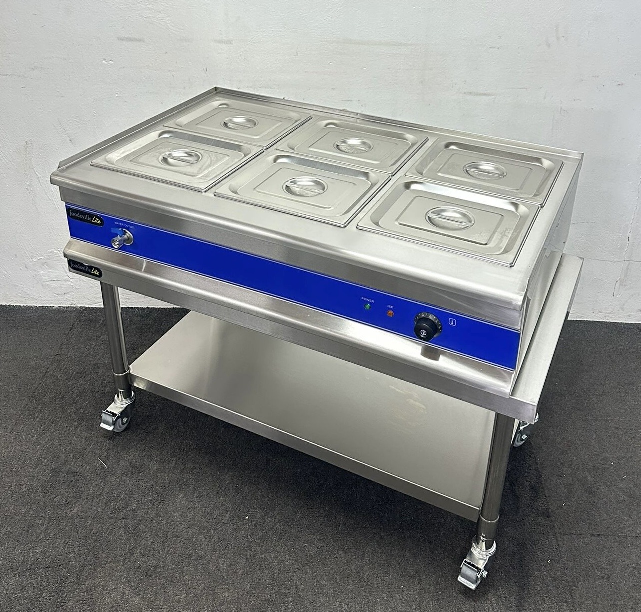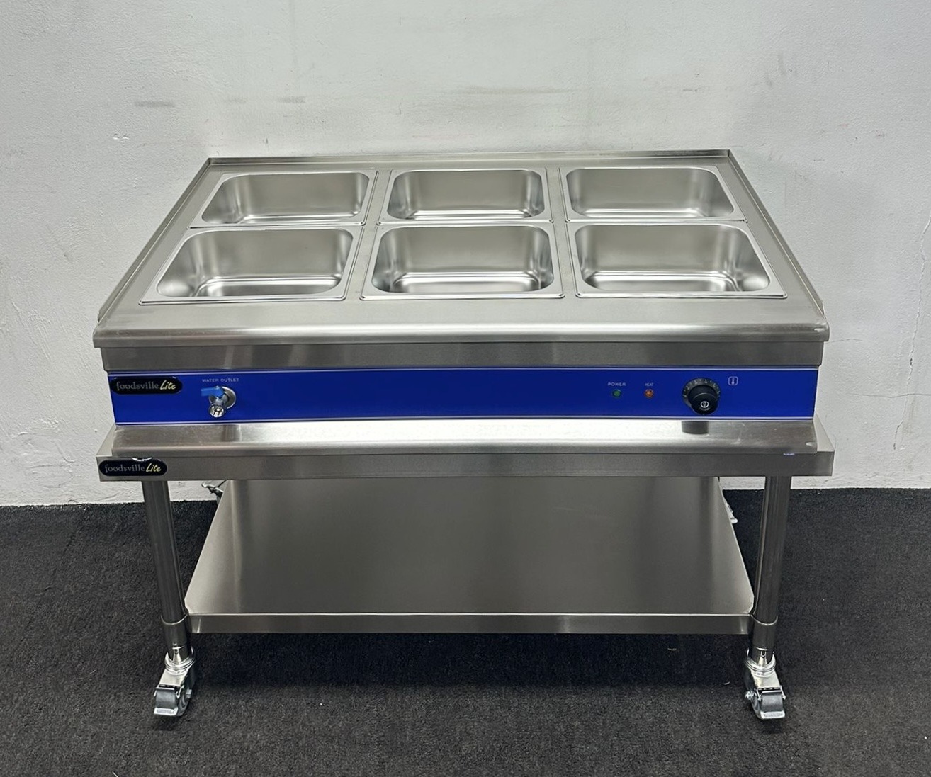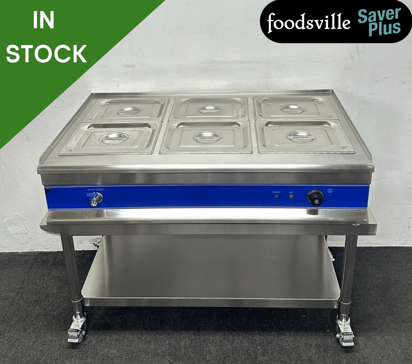 NEW Foodsville Saver Plus 1100mm 6 x 1/2 GN Countertop Bain Marie With Drain Tap, On Mobile Stand – 13 Amp Plug In & Go!