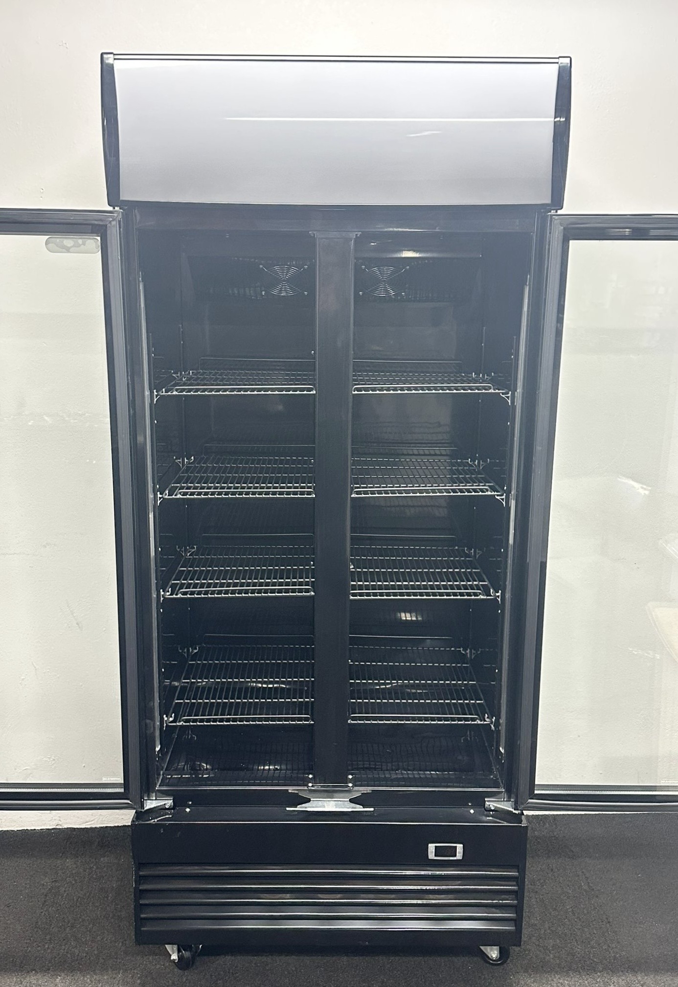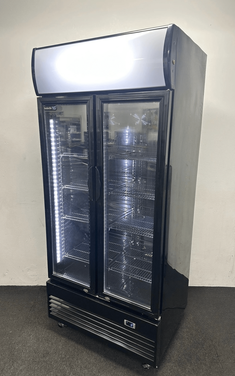 NEW Foodsville Lite 900mm Upright Double Glass Fronted Display Fridge, On Wheels