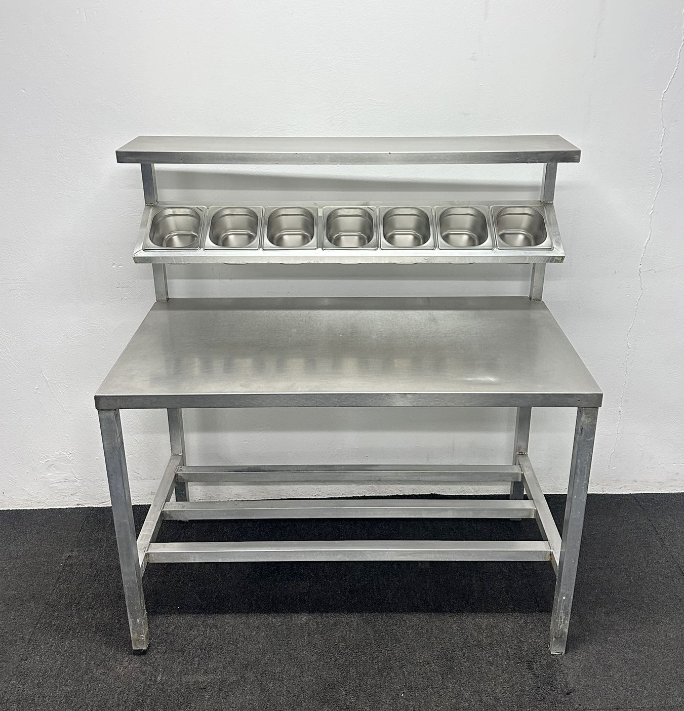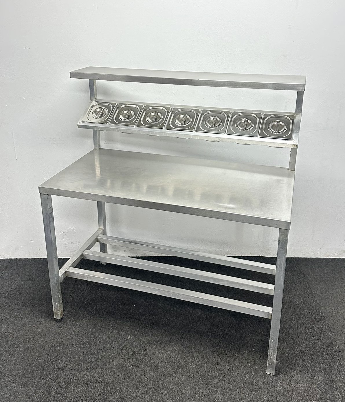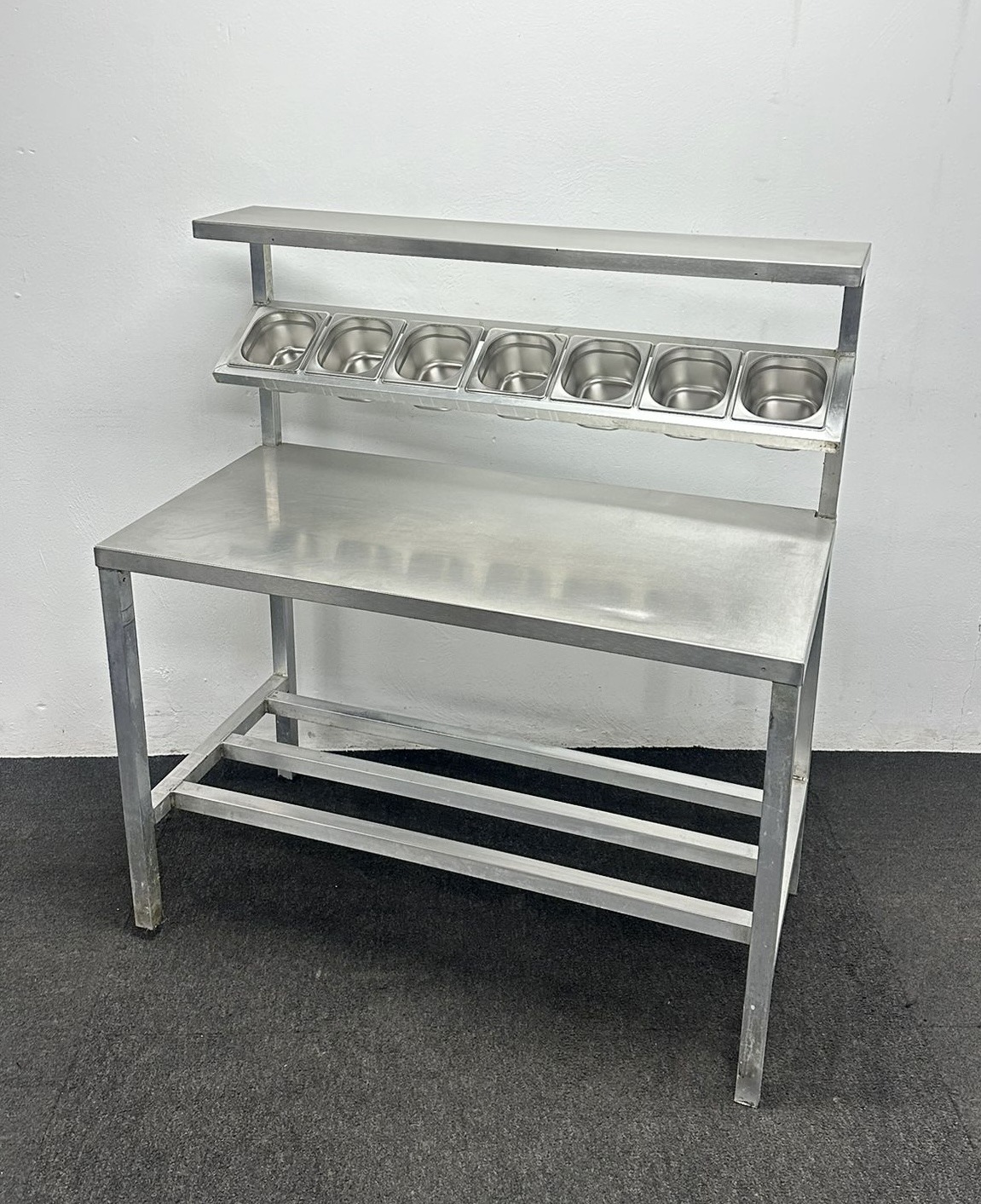 Used 1220mm Stainless Steel Centre Table With Undershelf & Garnish Rail – Includes G/N Containers!