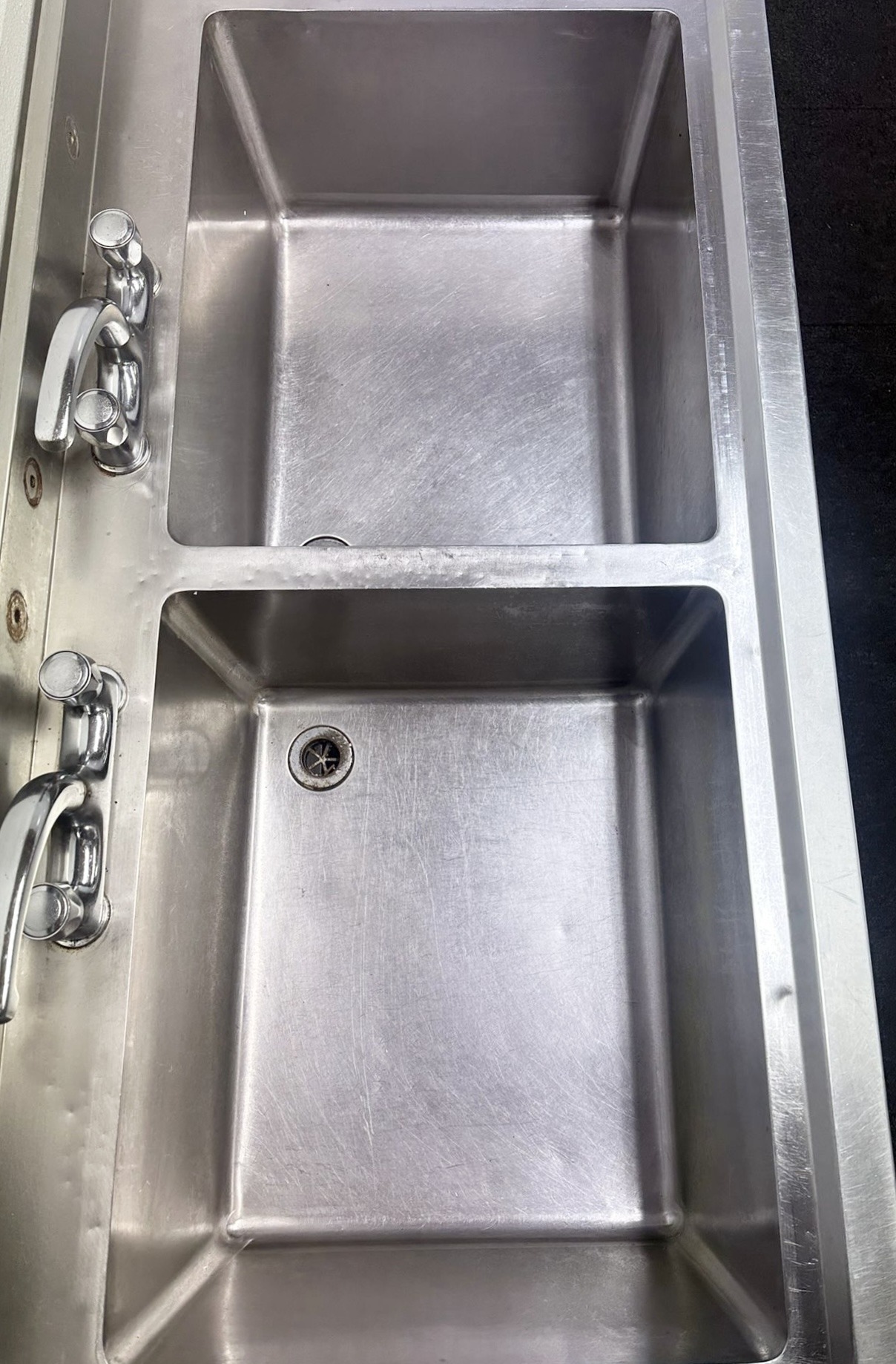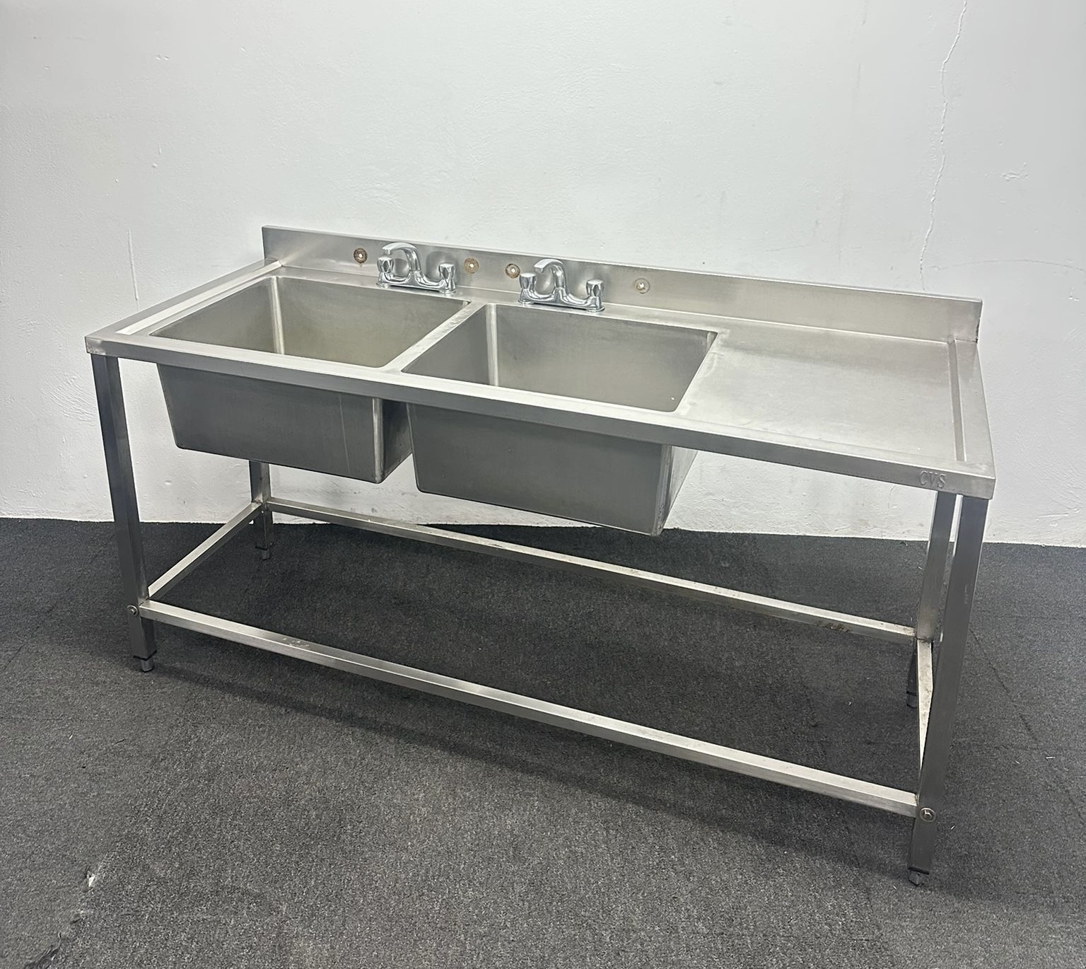 Used 1880mm Stainless Steel Double Bowl Sink – Right Hand Drainer. Includes Taps!