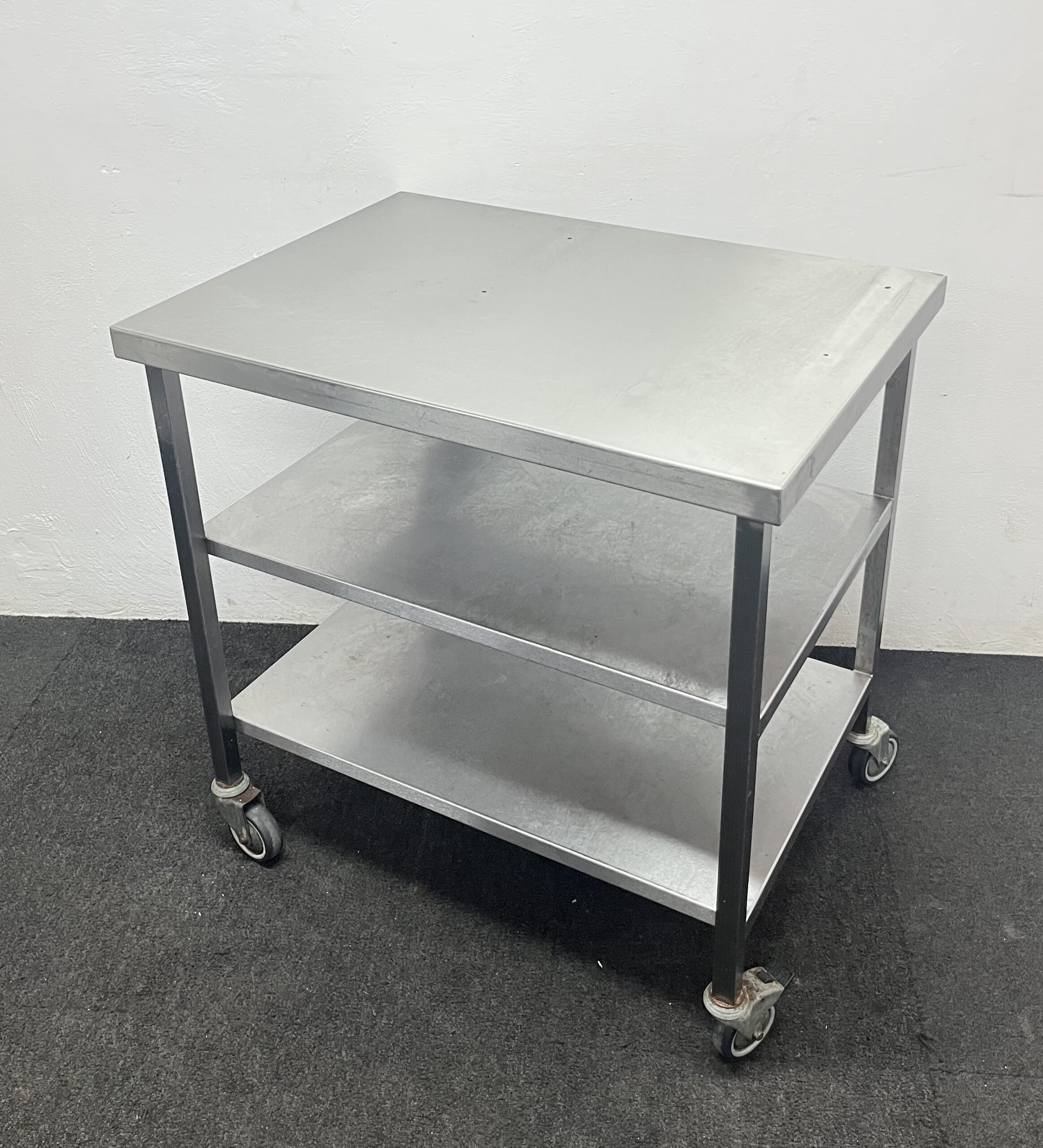 Used 900mm Stainless Steel Centre Table With Double Undershelf, On Wheels