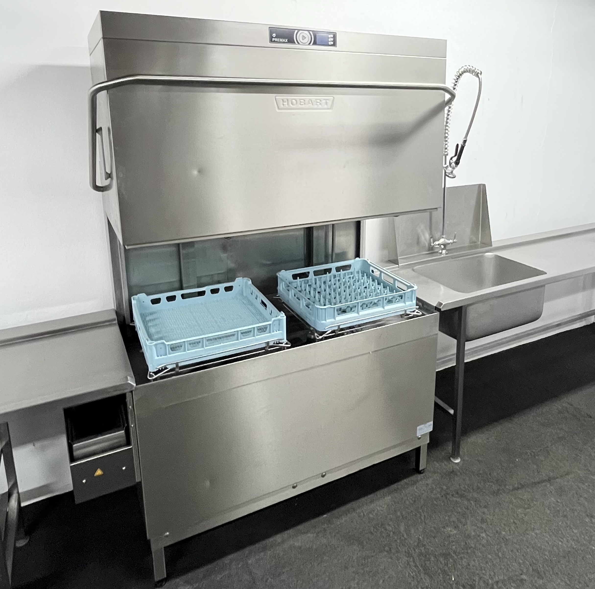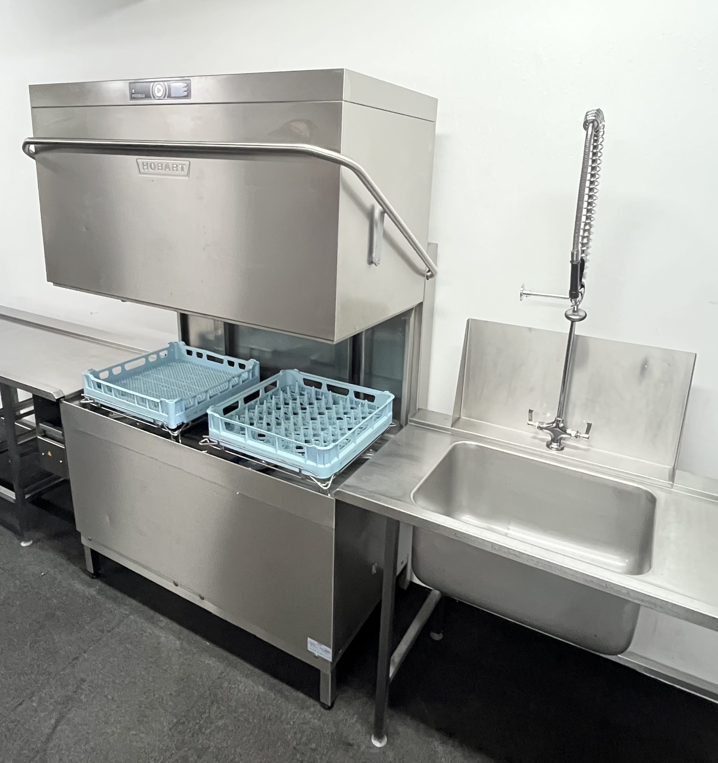 Used Hobart Premax AUPT-10A Double Pass Through Dishwasher With Entry Sink & Exit Table – 3 Phase Electric