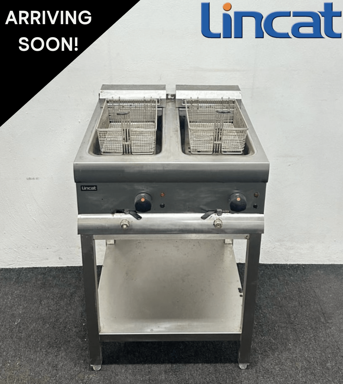 Used Lincat 2 x 9 Litre Twin Pan Twin Basket Fryer, On Stand With Undershelf – 13 Amp Plug In & Go!