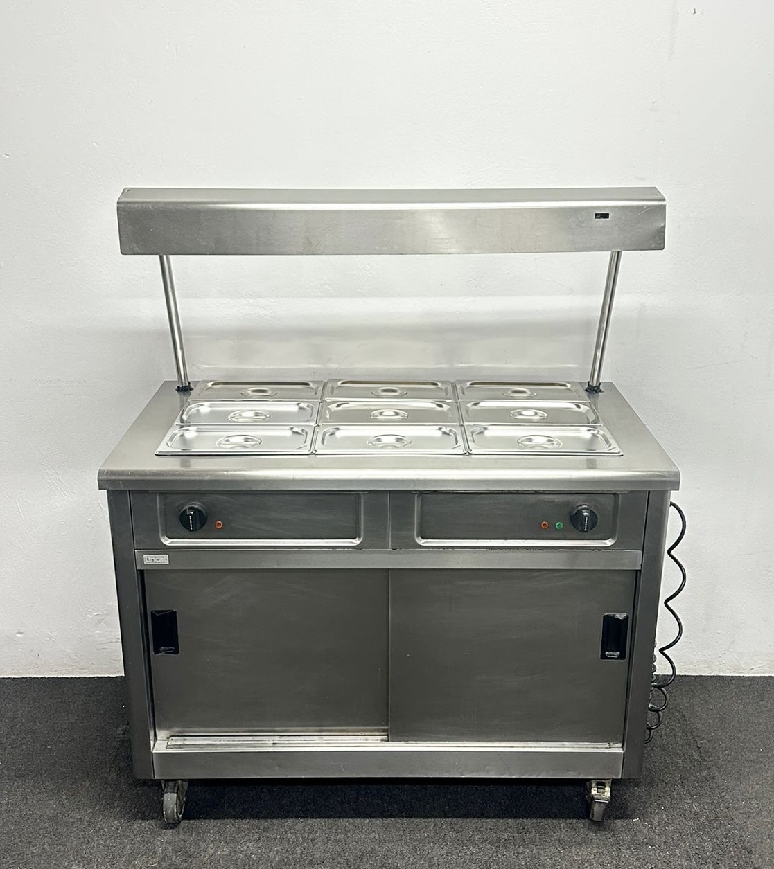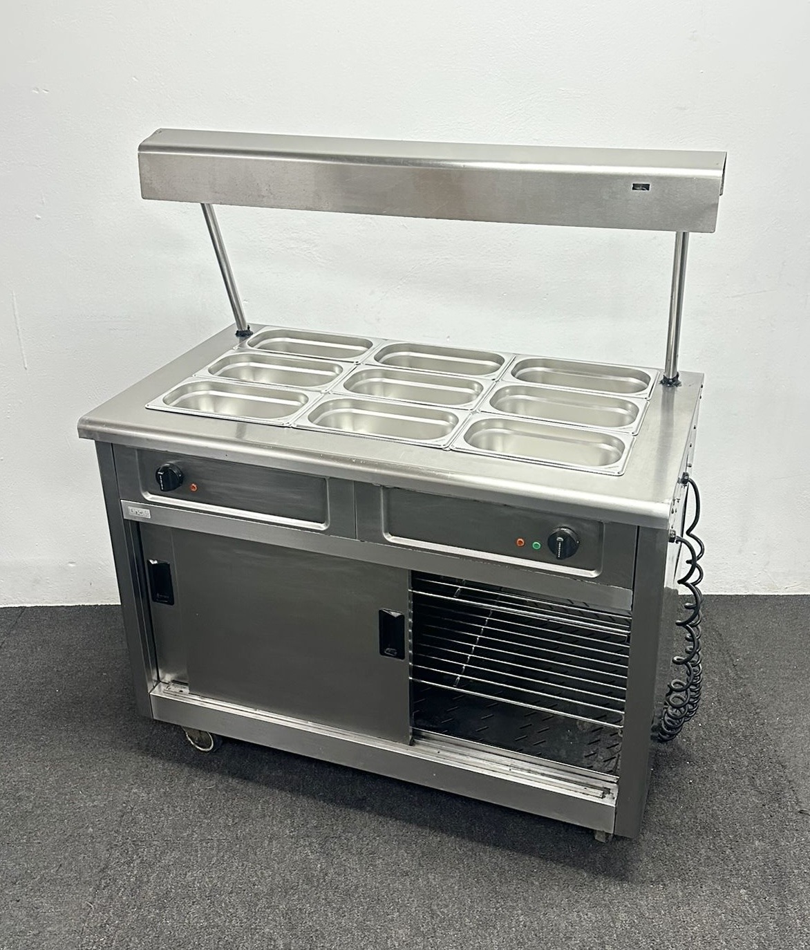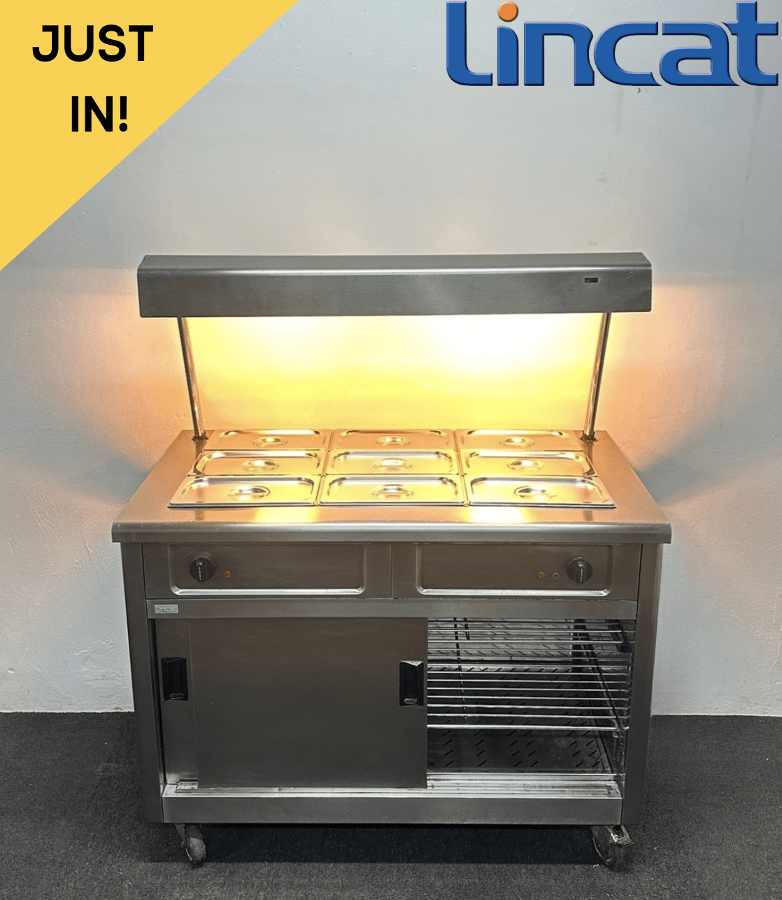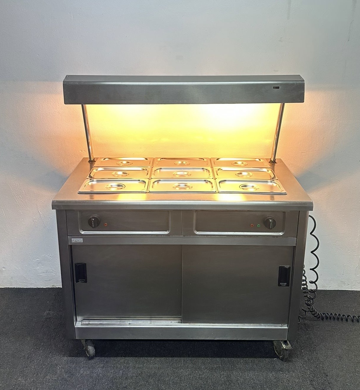 Used Lincat 3 x 1/1 GN Wet Well Bain Marie & Hot Cupboard With Heated Overgantry, On Wheels