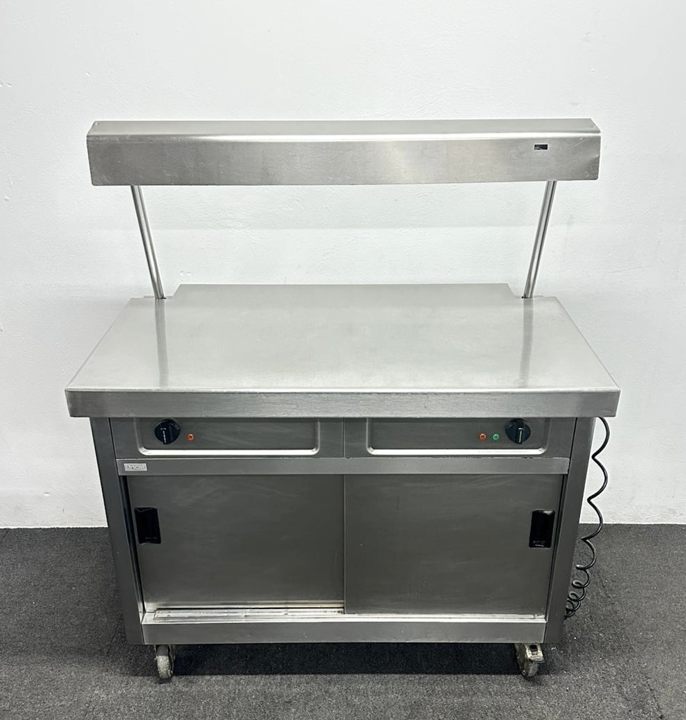 NEW Foodsville Lite 1500mm Stainless Steel Double Shelved Hot Cupboard With Double Heated Overgantry, On Wheels